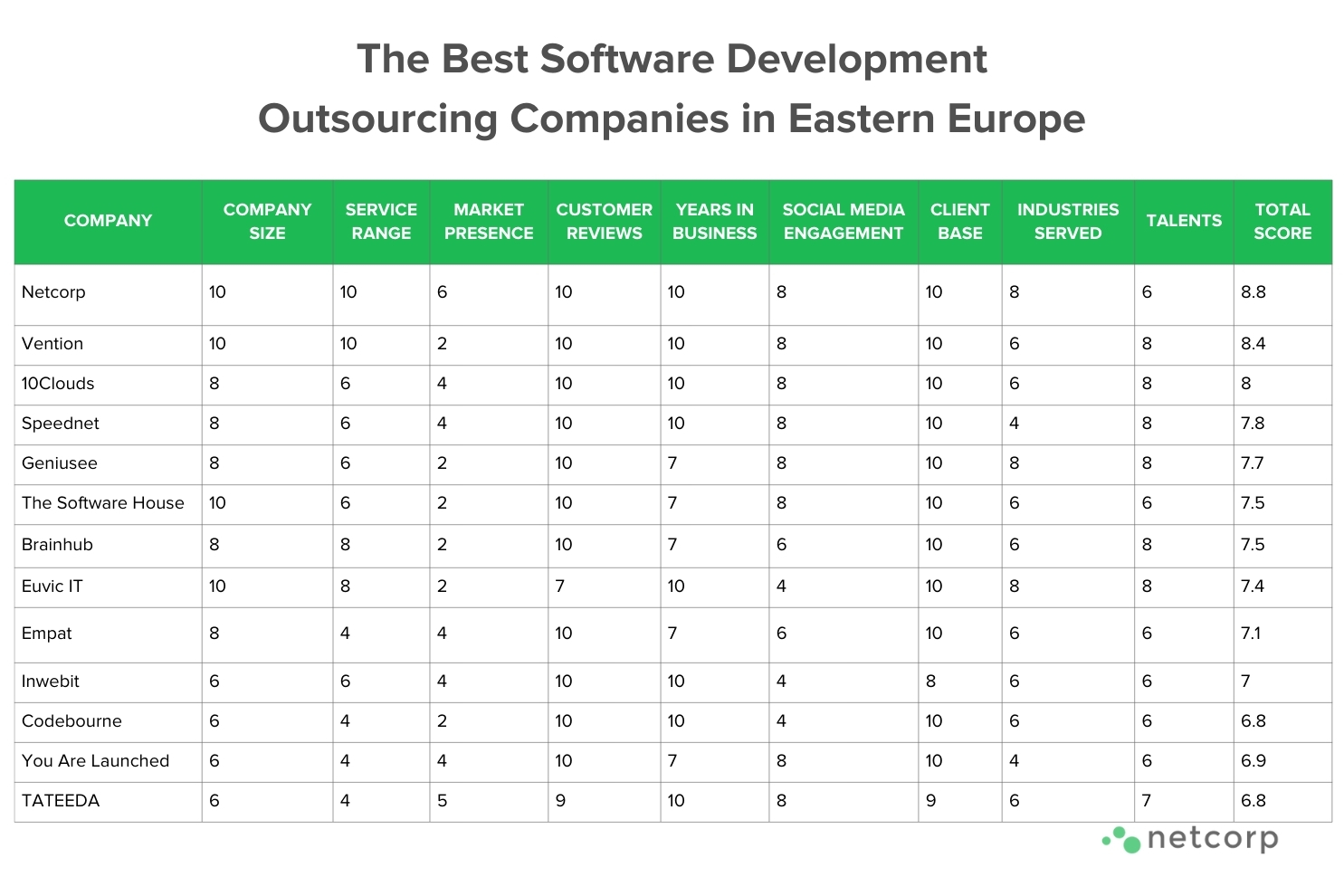 We have developed our scoring system to rank Eastern European companies based on several key factors. This system evaluates company size, service range, market presence, customer reviews, years in business, social media engagement, client base, industries served, and staff talent.